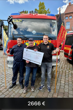 Sicher einer der Höhepunkte war zum Schluss der Blaulichtmeile die Bekanntgabe des Spendenbetrages aus der Aktion „Fritz radelt“. Zum Zeitpunkt der Spendenübergaben am Samstagabend waren es 2.666 € die auf das gemeinsame Konto der Jugendfeuerwehren Memmingen und Husum gingen. Im weiteren Verlauf sind weitere Spenden eingegangen. Aktueller Stand (05.09.2025) waren rund 4.500 €.