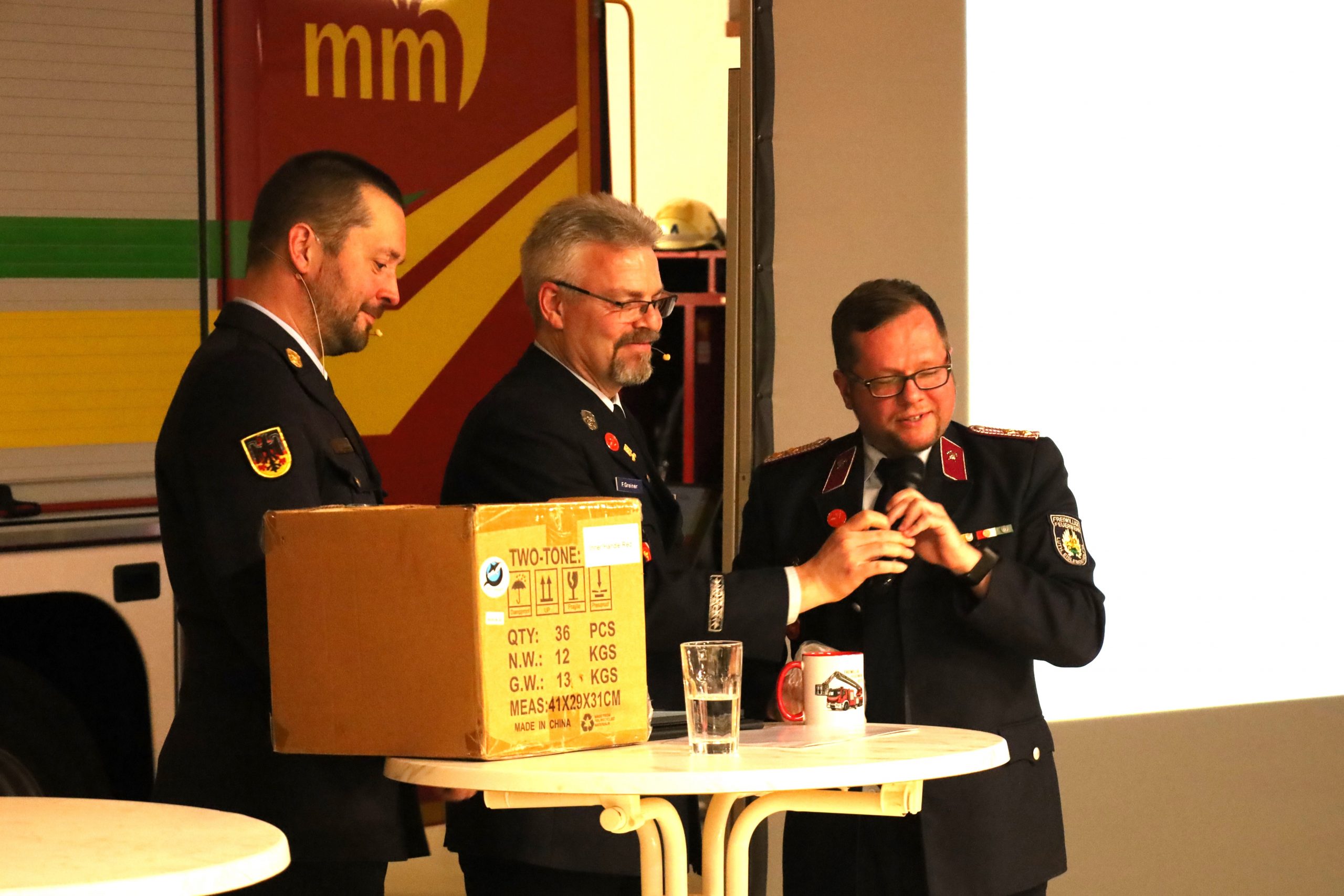 Frank Schulze von der Partnerfeuerwehr Helfta schenkte uns Tassen für die neue Küche, darauf die neue Drehleiter aus Helfta.