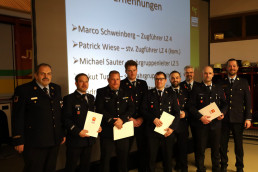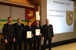 Als Kassenprüferin bestätigt wurde Maike Huber und neu hinzu kam Kathi Dietrich. Michael Stoeber und Katrin Thiel verabschiedeten sich als Vertreter der Löschzüge 4 und 5 aus der Vorstandschaft. An ihre Stelle traten Patrick Wiese (kom.) und Sebastian Priester. Der ehemalige Schriftführer Jonathan Buck bekam ein Präsent als Dank für sein Engagement in der letzten Vorstandschaft. Michael Stoeber wurde nach 11 Jahren Vorstandschaft als Vertreter des Löschzugs 4 das Vereinsabzeichen in Bronze verliehen. Der scheidende Schriftführer und zweiter Vorsitzende Markus Dangelmaier sowie der scheidende Kassenwart Michael Häberle wurden nach 20 bzw. 24 Jahren in der Vorstandschaft mit dem goldenen Vereinsabzeichen geehrt.